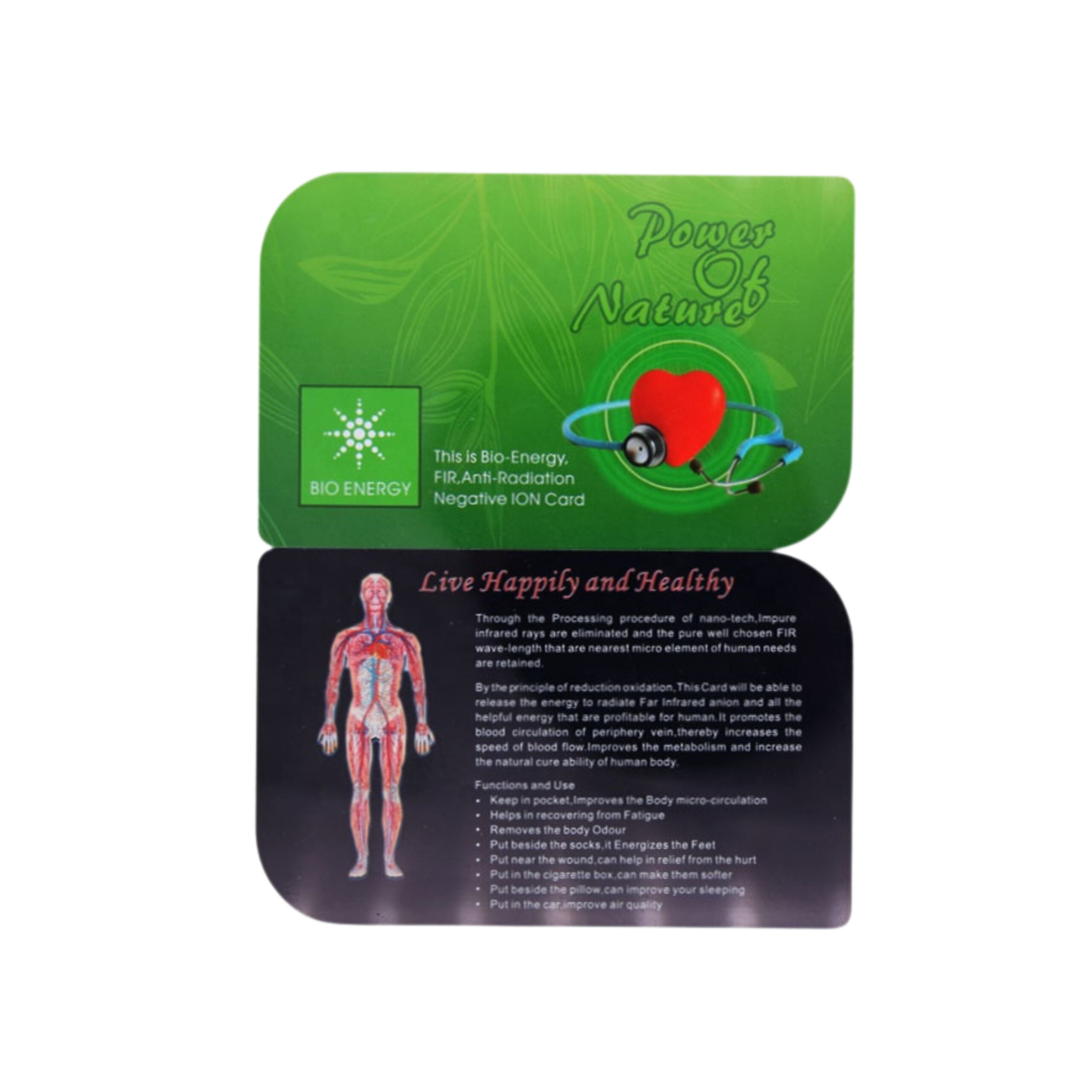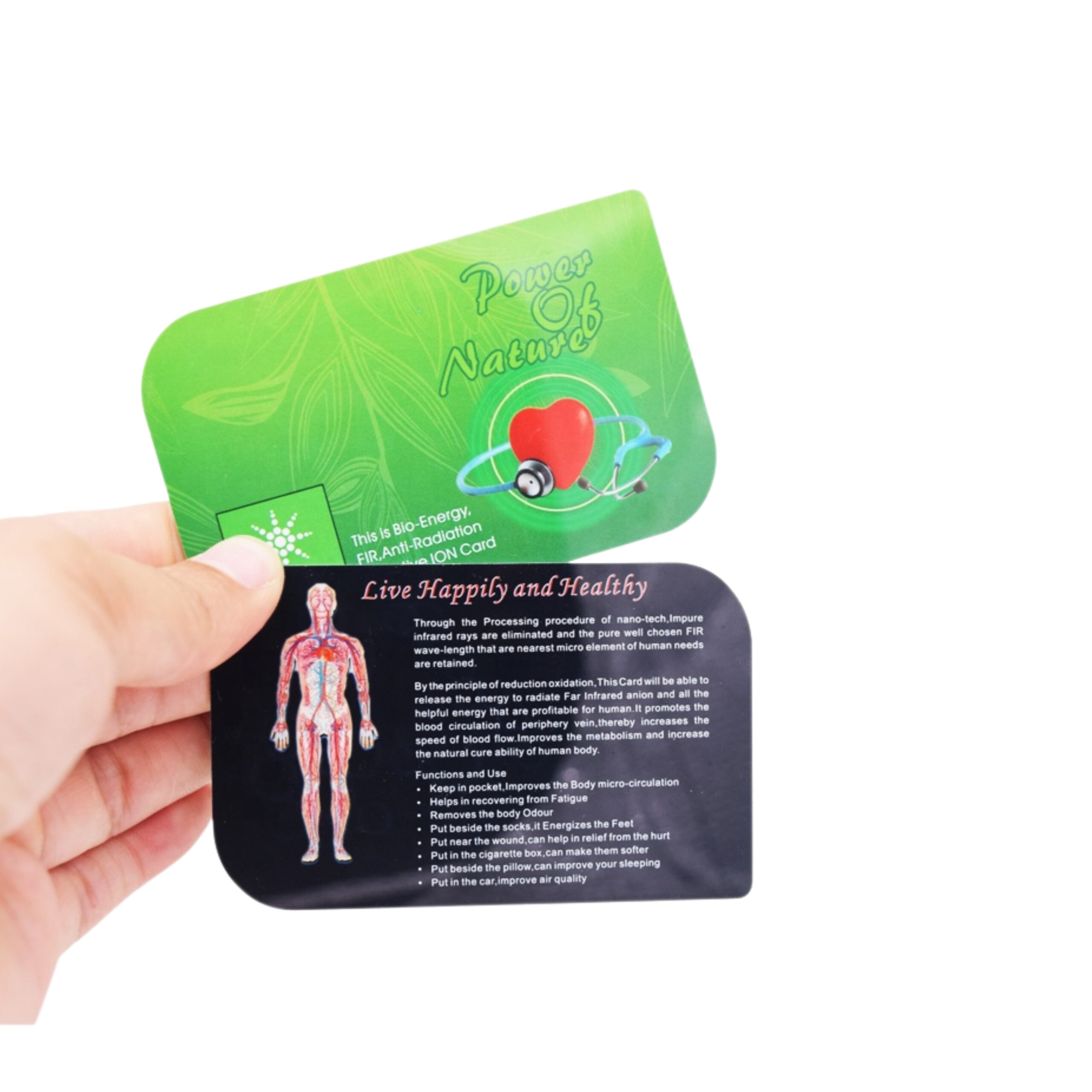 La tarjeta de nanoenergía puede nanocompuestos a temperatura ambiente, capacidad de transporte automático de rayos infrarrojos lejanos y campo magnético débil ad hoc, la energía térmica del cuerpo humano se convierte en la misma energía fotónica y frecuencia del cuerpo humano, lanzada a las profundidades del cuerpo humano. , con resonancia de onda y frecuencia de resonancia inherentes al cuerpo humano, para estimular la proteasa y las células, ajustando bidireccionalmente la ingeniería y el sistema endocrino del cuerpo humano, mejora la microcirculación y mejora la función inmune.